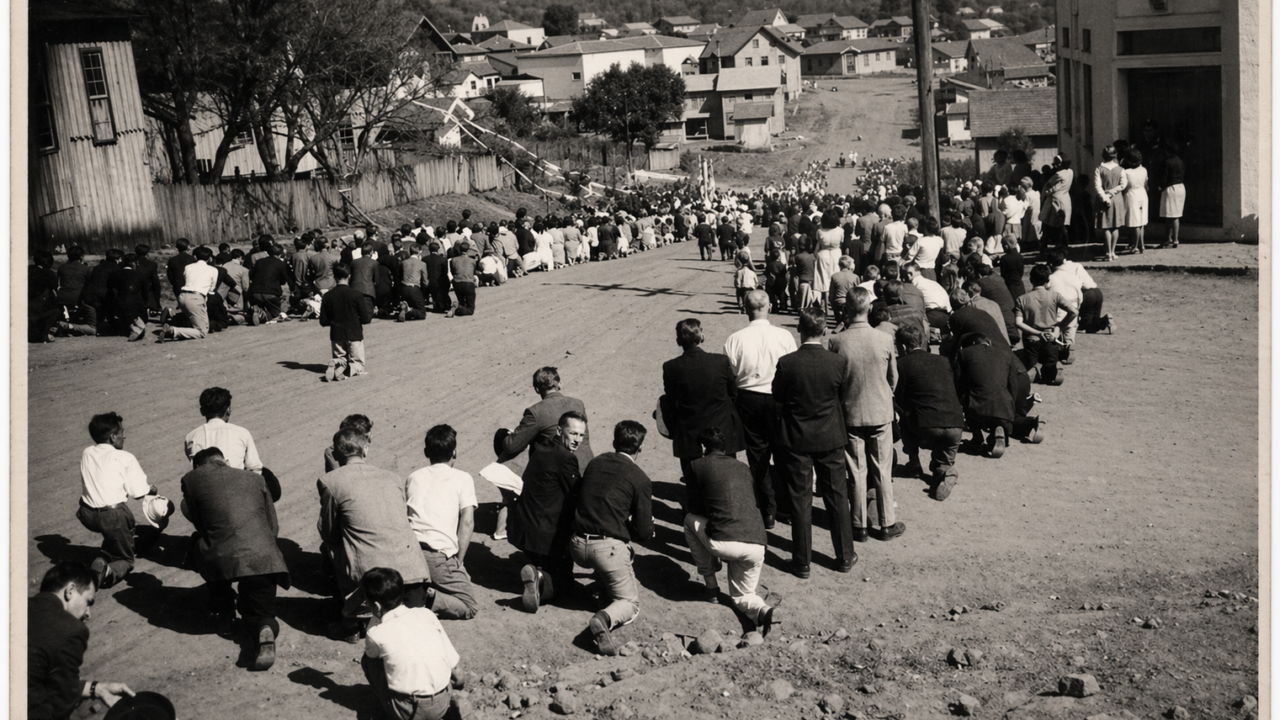 Você consegue reconhecer este lugar? Hoje, esse trecho da Rua Visconde de Guarapuava abriga a Câmara de Vereadores e o Banco do Brasil, mas há algumas décadas, o cenário era bem diferente. Nesta foto raríssima, vemos uma demonstração profunda de fé: uma procissão onde fiéis aparecem ajoelhados em…