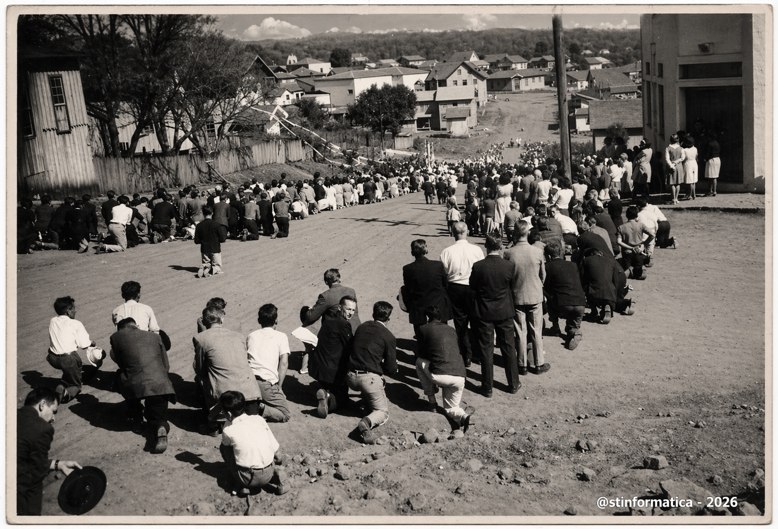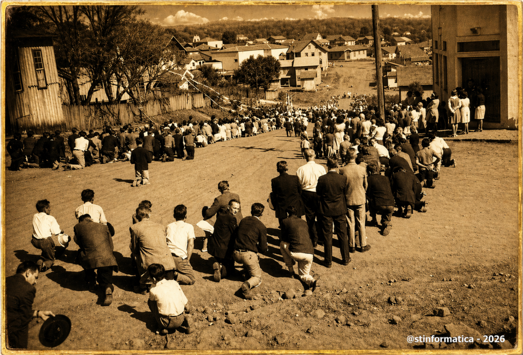Nesta foto raríssima, vemos uma demonstração profunda de fé: uma procissão onde fiéis aparecem ajoelhados em uma estrada que ainda era de terra pura. Um registro emocionante da nossa identidade e cultura!